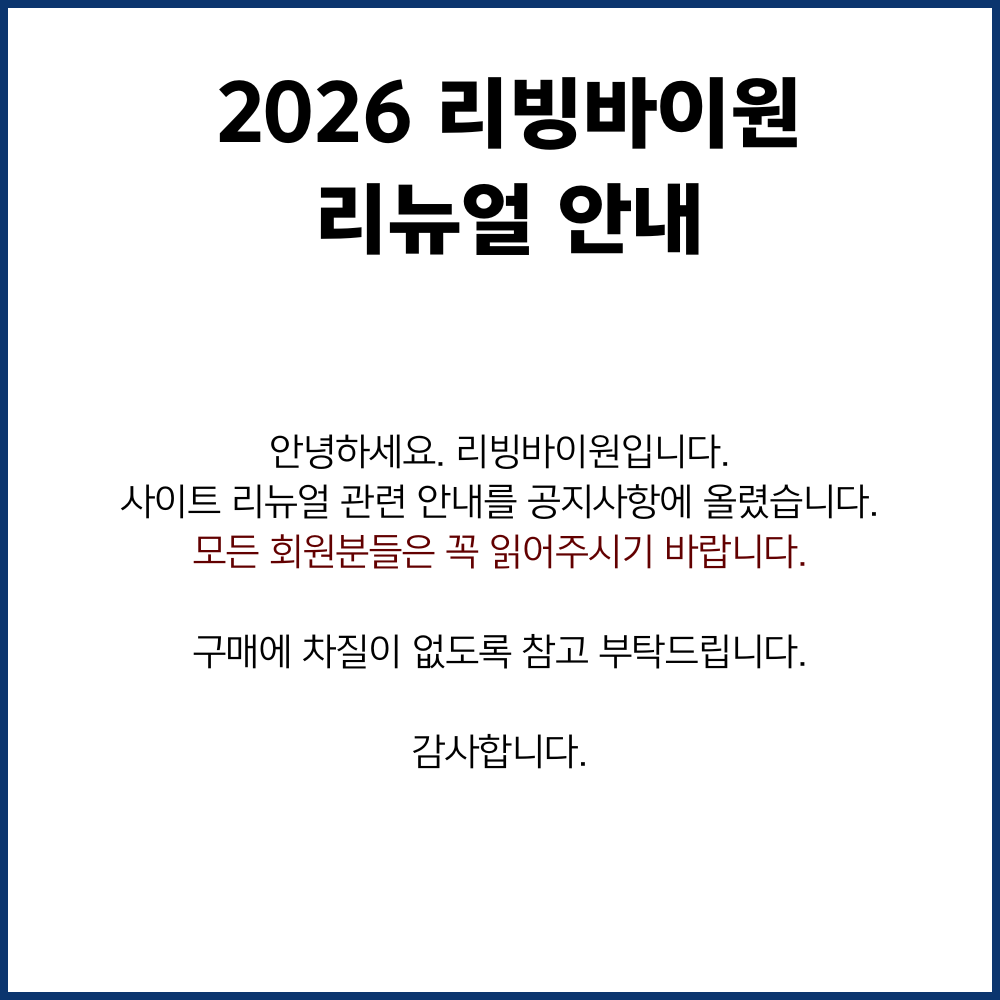 리빙바이원은 더욱 더 회원님들에게 좋은 상품과 좋은 서비스, 편리한 UI를 제공하기 위해 사이트 리뉴얼을 하고 있습니다. 기존 상품을 대폭 줄이고 경쟁력있는 제품과 자사 제품으로만 상품력을 갖추려고 하고 기존 상품들도 리뉴얼 과정 중에 있습니다. 해당 사항 변경 내용 아래에 전달 드립니다. 참고 부탁드립니다.