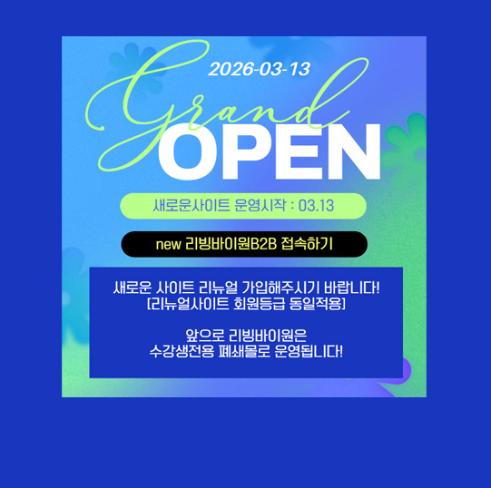 현재 리빙바이원에는 자사 제품과 협력제품을 제외한 브랜드관 제품이 있습니다. 사이트 리뉴얼 후에 브랜드관 제품들이 삭제됩니다. 앞으로는 자사 제품을 적극적으로 제조해 회원님들에게만 제공하는 상품들로만 구성할 예정이며, 그 외에 가격과 원료, 상품에서 경쟁력이 있는 상품들을 엄선해 소수의 브랜드만 입점을 하여 특별성이 있는 도매몰로 발전하려고 합니다.